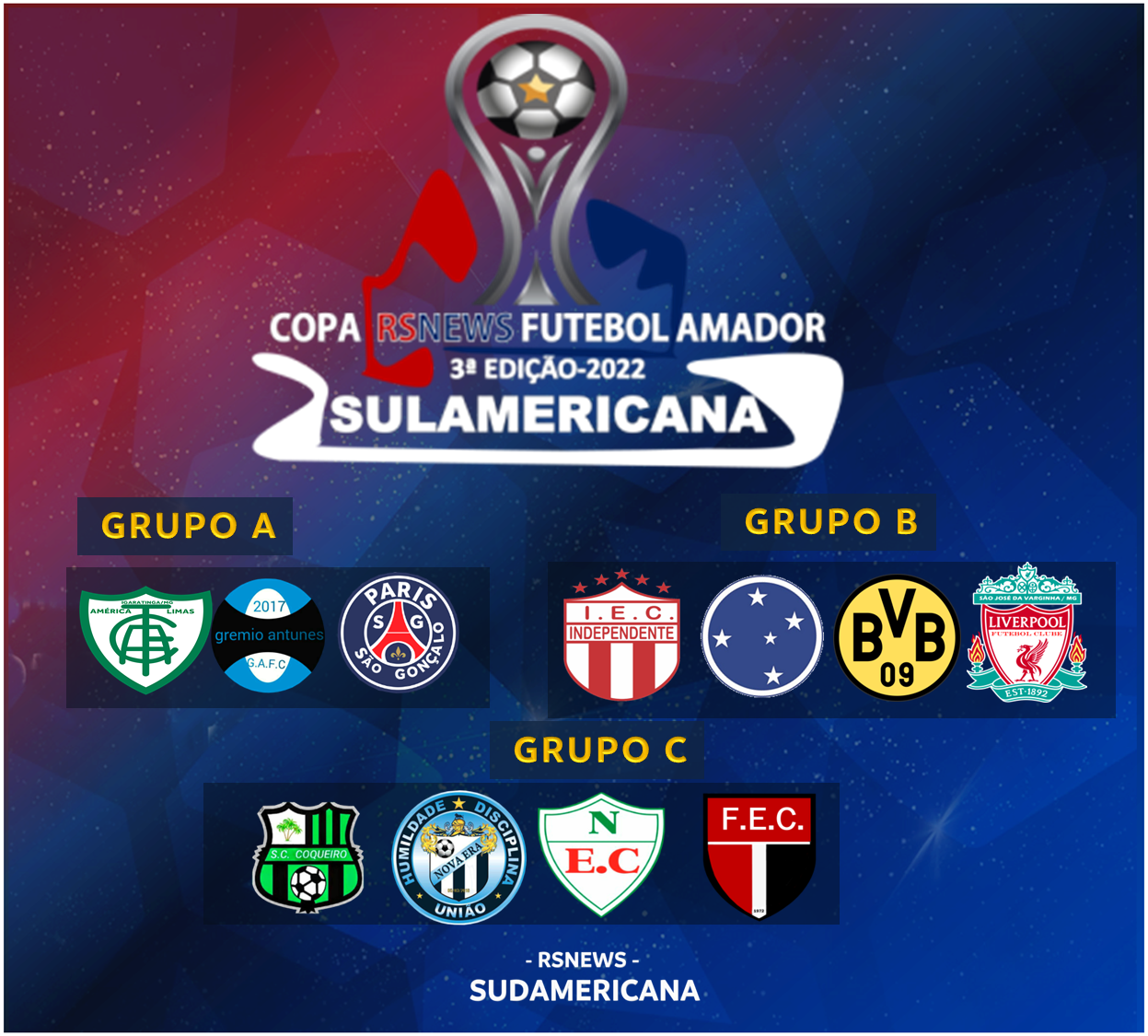 Começou no último final de semana, a RSNEWS SULAMERICANA 2022, 11 times estão na 3ª edição, divididas em 3 grupos , o grupo A com 3 times e os grupos B e C com 4 times. A copa teve início em 13 de novembro com a partida entre Nova Era de Pitangui e Coqueiros de Pitangui.No Grupo A estão Grêmio de Antunes, América dos Limas e Paris São Gonçalo do Pará, já no Grupo B estão Liverpool, Borussia e Cruzeiros do Sul, ambos de São José da Varginha e mais o Independente de Chacara de Maravilhas. E no grupo C, Coqueiros, Niteroi e Nova Era , ambos de Pitangui mais o Flamengo de Conceição do Pará.Todas as partidas terão a cobertura dos canais da RS NEWS pelo aplicativo ou por provedores de TV por assinatura que tem os canais RS NEWS SPORTS. Atualmente o aplicativo RSNEWS disponível em Android tem todos os canais como nas plataformas IOS e o app RS NEWS WEB TV que encontra-se nas plataformas Android TV , Roku TV e Amazon Fire TV, em todas as plataformas totalmente gratuito e sem a necessidade de login e senha.
