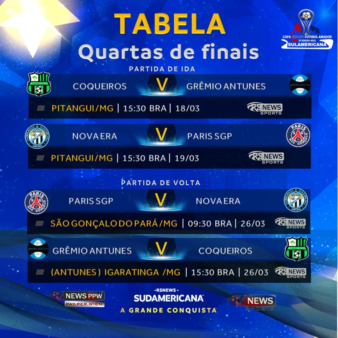 Neste final de semana tem as partidas de ida das quartas de finais da RSNEWS SULAMERICANA 2022. Ambas serão realizadas na cidade de Pitangui e no mesmo horário, no sábado, no Campo do Niterói, o Coqueiros de Pitangui recebe o Grêmio de Antunes e no domingo o Nova Era de Pitangui recebe o Paris de São Gonçalo do Pará.Todas as partidas terão transmissão do canal da RS NEWS SPORTS, encontra-se em vários provedores de TV por assinatura ou no aplicativo próprio do canal, nas plataformas Android, Apple , Roku TV e Amazon Fire TV, também no site dos canais da RS NEWS no link: https://www.rsnewswebtv.com.br/ . As partidas de volta será no outro final de semana, ambas partidas serão no domingo dia 26 de Março. Na parte da manhã em São Gonçalo do Pará, o Paris recebe o Nova Era e na parte da tarde na comunidade de Antunes, distrito da cidade de Igaratinga, o Grêmio recebe o Coqueiros.