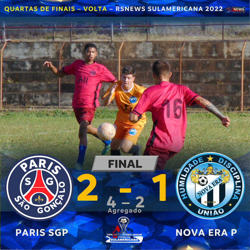 Na cidade de São Gonçalo do Pará, o Paris de São Gonçalo do Pará recebeu o Nova Era de Pitangui pelas quartas de finais, partida de volta da RSNEWS SULAMERICANA 2022. Na partida de ida, vitória do Paris por 2 a 1.Na tarde deste sábado, no 1º tempo o Nova Era abriu o placar com Guilherme Dinamite de pênalti. O resultado estava levando a decisão para as penalidades. No 2o tempo , entorno dos 20 minutos, de falta, o atacante Kaio empatou para o Paris e a virada veio com o Leandro de falta aos 30 minutos, decretando placar final. Acompanha os gols desta partida. O resultado garantiu o Paris na semifinal, terá pela frente o Niterói de Pitangui. A partida de ida será em Pitangui e a volta em São Gonçalo do Pará. A arbitragem da partida foi de Breno Fonseca com os assistentes José Mario e Jussara Ferreira.Um bom público este no Estádio Sebastião Ferreira do Amaral, que é o Campo do Grêmio de São Gonçalo do Pará. Acompanha a partida na integra no youtube.