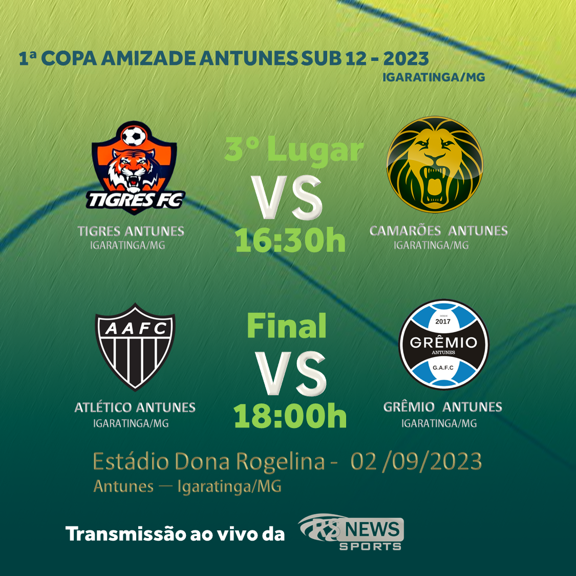 FUTEBOL DE BASE NA RS NEWS SPORTS - No próximo sábado tem a cobertura completa da 1ª Copa Amizade de Antunes Sub12-2023, realizado na comunidade de Antunes , distrito de Igaratinga, Minas Gerais. No sábado dia 02 de setembro vai definir o campeão e o vencedor do 3º lugar. As partidas serão realizadas no Estádio Dona Rogelina, as 16:30h, tem Tigres enfrenta o Camarões pela definição do 3º lugar e as 18:00h, a grande final, entre Atlético e Grêmio. Todas as partidas com transmissão da RS NEWS SPORTS. A melhor cobertura continua aqui, torcemos juntos.