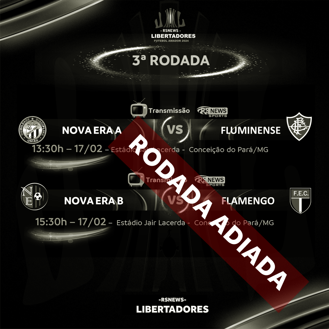 A 3ª rodada da RSNEWS LIBERTADORES 2024 que estava marcada inicialmente para o dia 17 de fevereiro foi adiada para dia 09 de março. O adiamento ocorreu pelo fato do estado do gramado do Estádio Jair Lacerda encontrar se totalmente alagado devido as chuvas e também com gramado alto. O Nova Era A e Nova Era B , ambos de Pitangui, optaram por usar o campo pelo fato na cidade de Pitangui também os campos também estavam interditados. Então por isso a rodada irá prosseguir agora dia 25 de fevereiro na cidade de Conceição do Pará.