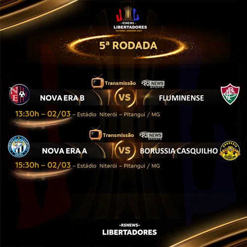As partidas da 5ª rodada da RSNEWS LIBERTADORES 2024, serão no Estádio do Niterói, na cidade de Pitangui/ MG. Neste final de semana tem a 5ª rodada da RSNEWS LIBERTADORES 2024, o Nova Era B de Pitangui enfrenta o Fluminense de Conceição do Pará, no dia 02 de março, as 13:30h, logo em seguida, o Nova Era A de Pitangui enfrenta o Borussia do Casquilho de Conceição do Pará, as 15:30h, as partidas terão transmissão da RS NEWS SPORTS.