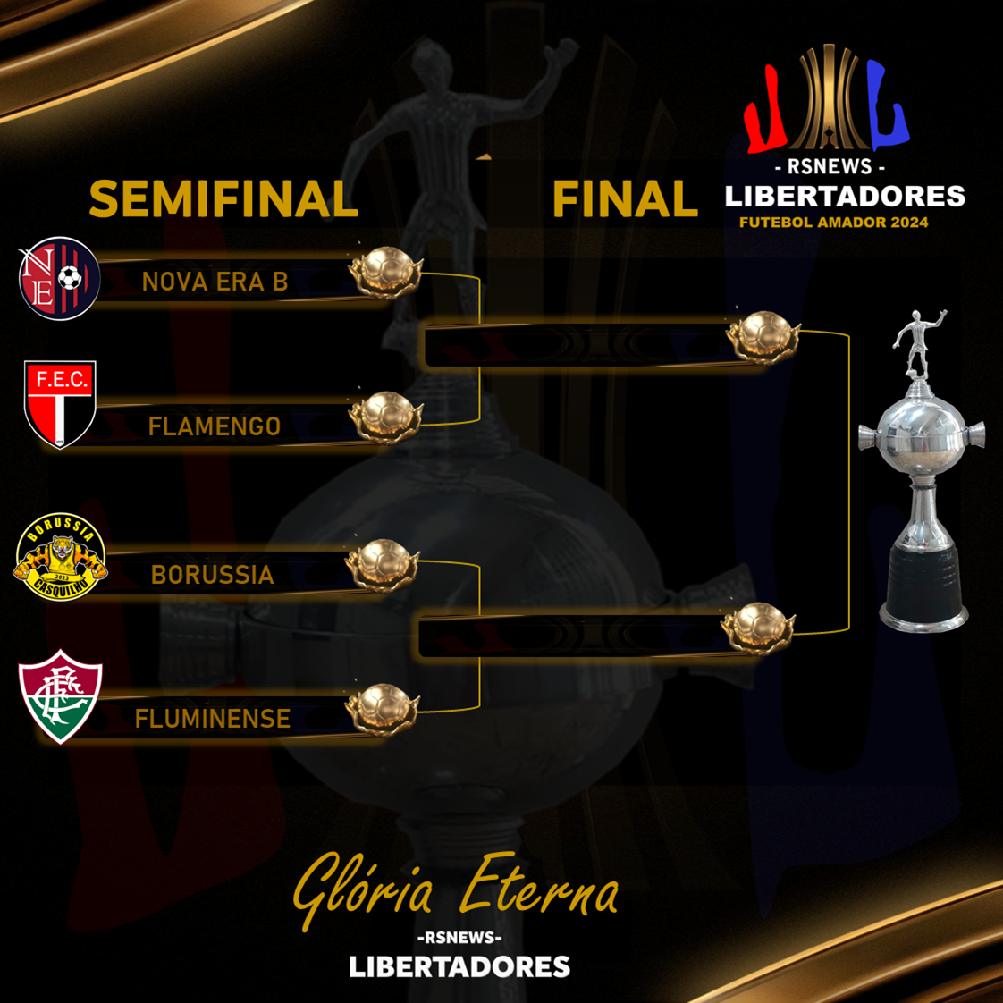 Fim de jogo na cidade de Pitangui, pela última partida da fase de grupo, o Nova Era B de Pitangui foi soberano em campo e venceu por 7 a 1 o Flamengo de Conceição do Pará, destaque para Leonaidas Araujo e Luis Ribeiro, cada um com 2 gols na partida.Após a realização da última partida pela fase de grupo, ficou definido os confrontos das semi finais da RSNEWS LIBERTADORES 2024. Borussia e Fluminense se enfrentam e do outro lado, teremos Nova Era B e Flamengo. As partidas são de ida e volta.Definido os confrontos das semifinais da RSNEWS LIBERTADORES 2024, são partidas de ida e volta. O Nova Era B de Pitangui, que teve melhor campanha, vai enfrentar o Flamengo de Conceição do Pará, que foi a 4ª melhor campanha. A outra semifinal, o Borussia do Casquilho de Conceição do Pará, segunda melhor campanha, vai enfrentar o Fluminense de Conceição do Pará que teve a 3ª melhor campanha. Isso é alma e coração, em busca da Glória Eterna.