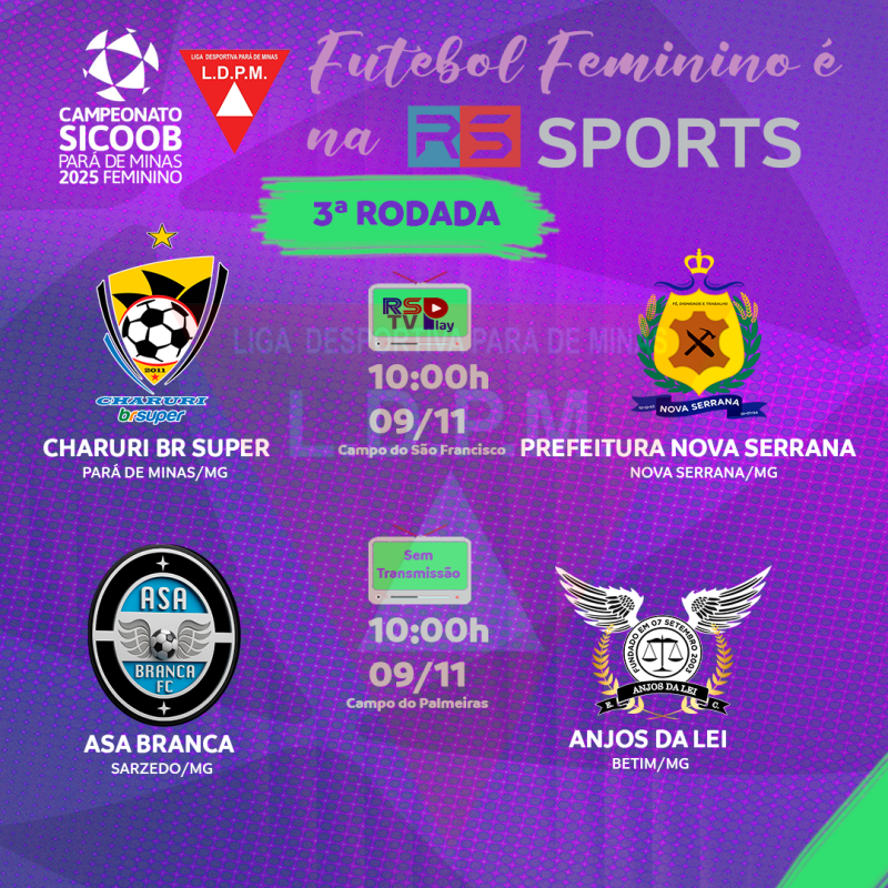 Definida a 3ª rodada do Campeonato Sicoob Feminino 2025, serão duas partidas no mesmo horário, às 10h00, neste domingo, dia 9 de novembro. No Estádio José Maria de Castro, Campo do São Francisco, o confronto será entre Charuri BR Super de Pará de Minas e Prefeitura de Nova Serrana, e no Estádio Donizete da Silva Santos, Campo do Palmeiras, entre Asa Branca de Sarzedo e Anjos da Lei de Betim.Na tabela oficial, constava que a partida entre Anjos da Lei e Asa Branca seria às 15h30, porém, em comum acordo, as equipes optaram pelo horário das 10h00. A RS PLAY TV irá transmitir a partida entre Charuri BR Super e Nova Serrana; a outra partida, entre Asa Branca e Anjos da Lei, não terá transmissão do canal, em virtude de o Campo do Palmeiras não possuir cabine de transmissão.Às 10h, no Estádio Donizete dos Santos Silva, Campo do Palmeiras, Anjos da Lei de Betim e Asa Branca de Sarzedo entram em campo pela 3ª rodada. Ambas as equipes precisam da vitória. Na 1ª rodada, o Anjos da Lei estreou com derrota para Prefeitura de Nova Serrana por 2 a 1. Enquanto o Asa Branca estreou com derrota para Charuri BR Super de Pará de Minas.A partida, como foi dito anteriormente, o motivo de não ter a transmissão da RS PLAY TV, em virtude do horário oficial, a RS PLAY estará fazendo a cobertura da outra partida (Charuri BR Super e Prefeitura de Nova Serrana) e, também, a partida estava marcada para o horário 15h30. As equipes optaram por antecipar o horário da partida em comum acordo.Diga-se de passagem, no dia em questão, o Estádio José Porfírio de Oliveira, Campo do Guarani, não terá partida no horário das 15h30, o qual é considerado o melhor gramado da cidade. Rafael Saraiva, dos canais da RS SPORTS, alegou porque na partida entre Nova Serrana e Cruzeiro do Sul, foi bastante questionado por não ter transmitido a partida entre Charuri e Asa Branca. Charuri BR Super de Pará de Minas e Prefeitura de Nova Serrana vão a campo às 10h também, no dia 9 de novembro, no Estádio José Maria de Castro, campo do São Francisco. A partida vale a liderança e também garante o 1º classificado para a semifinal.A partida terá a transmissão da RS PLAY TV. Ambas as equipes estão com 100% de aproveitamento, com 2 vitórias cada. Isso é emoção, futebol feminino é na RS PLAY TV. Torcemos juntos.
