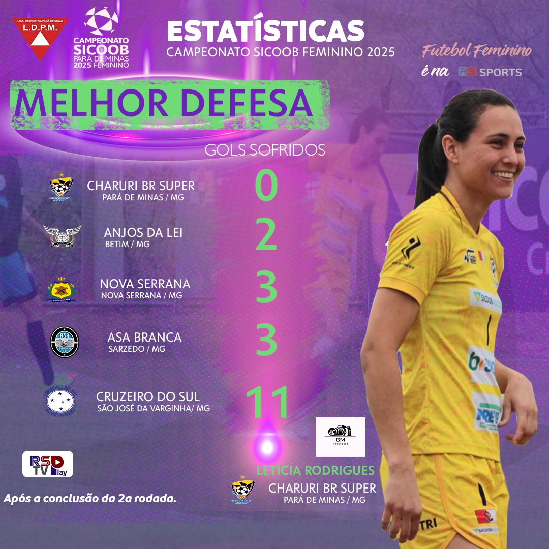 Ainda é bastante cedo para dizer, após duas rodadas, que o Asa Branca de Sarzedo e o Anjos da Lei de Betim, ambas as equipes entraram somente uma vez em campo, enquanto Charuri BR Super de Pará de Minas, Prefeitura de Nova Serrana e Cruzeiro do Sul de São José da Varginha já fizeram duas partidas cada. Então os dados não estão completos, com todas as equipes com o mesmo número de partidas.Neste momento, a melhor defesa após duas rodadas é a equipe do Charuri BR Super de Pará de Minas, destaque para a goleira Letícia Rodrigues, que ainda não sofreu nenhum gol na competição. Ano passado, Letícia esteve na equipe profissional do Betim, no Campeonato Mineiro Feminino organizado pela FMF.Também, Letícia estava na campanha dos títulos de 2023 e 2024 do Campeonato Sicoob organizado pela LDPM (Liga Desportiva de Pará de Minas) com a equipe do Charuri.Em 2021, foi realizado na cidade de Pará de Minas o Campeonato Feminino, com a organização da prefeitura de Pará de Minas, no qual duas equipes de Pará de Minas fizeram a final.Também, Letícia estava no elenco que sagrou-se campeão, que, diga-se de passagem, foi a equipe do Charuri. Acompanhe todos os detalhes do futebol feminino aqui na RS SPORTS. As imagens são GM Photos ( Gabriel Moraes ).